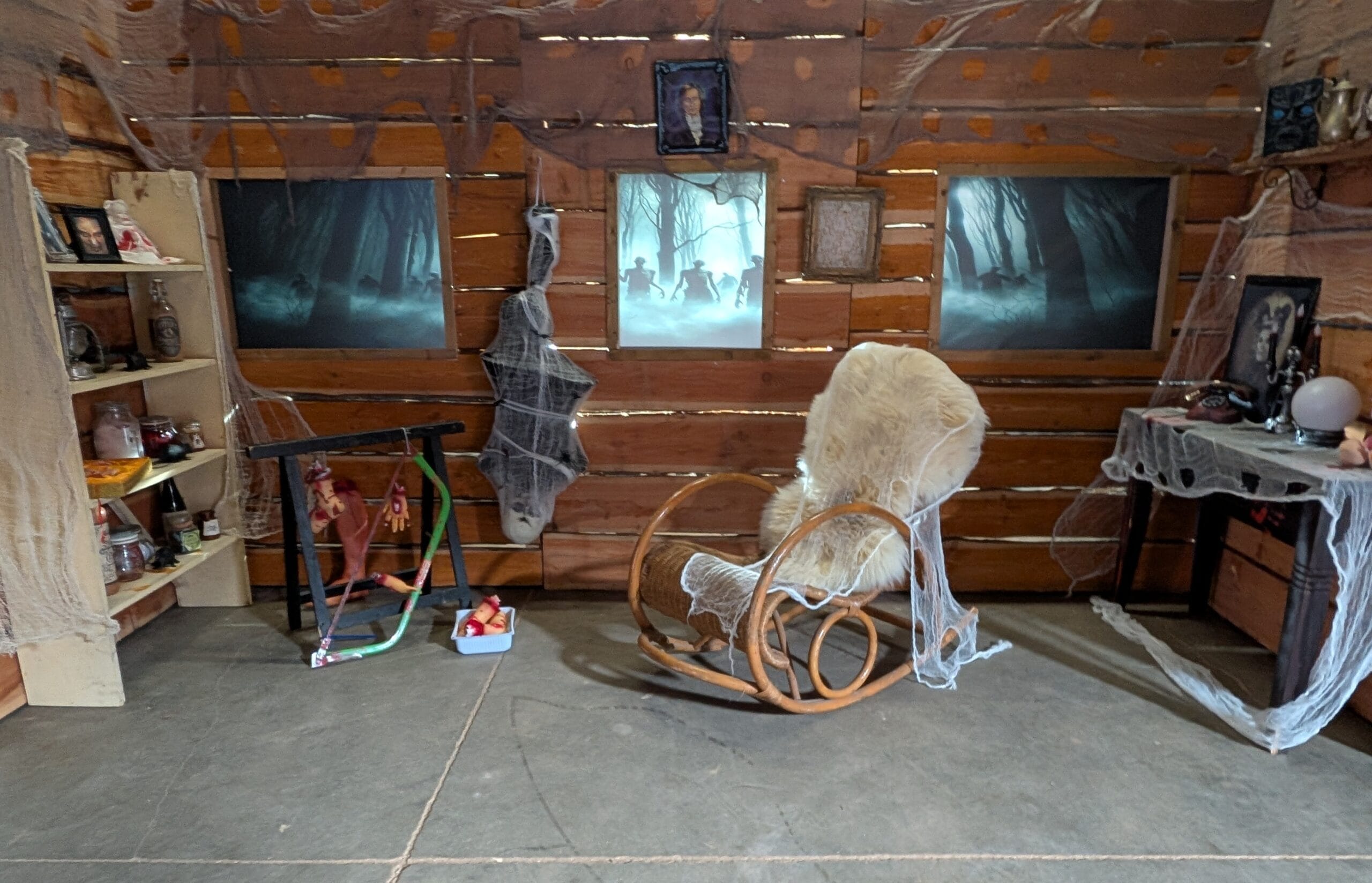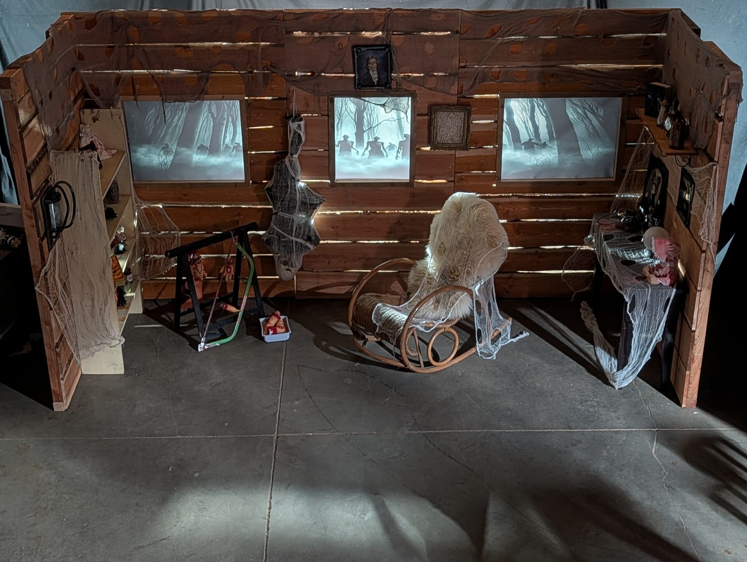 Sie möchten für Ihre Feier eine Halloween Spukhaus Deko mieten? Dann ist diese eindrucksvolle Kulisse genau die richtige Wahl. Mit ihrer düsteren Holzoptik, den geheimnisvollen Bildern, Spinnweben und schaurigen Details verwandelt sie jede Location im Handumdrehen in ein verlassenes Haunted House. Dadurch entsteht sofort die passende Stimmung für eine Halloweenparty, ein Firmenevent, eine Themenfeier oder eine gruselige Promotion-Aktion.