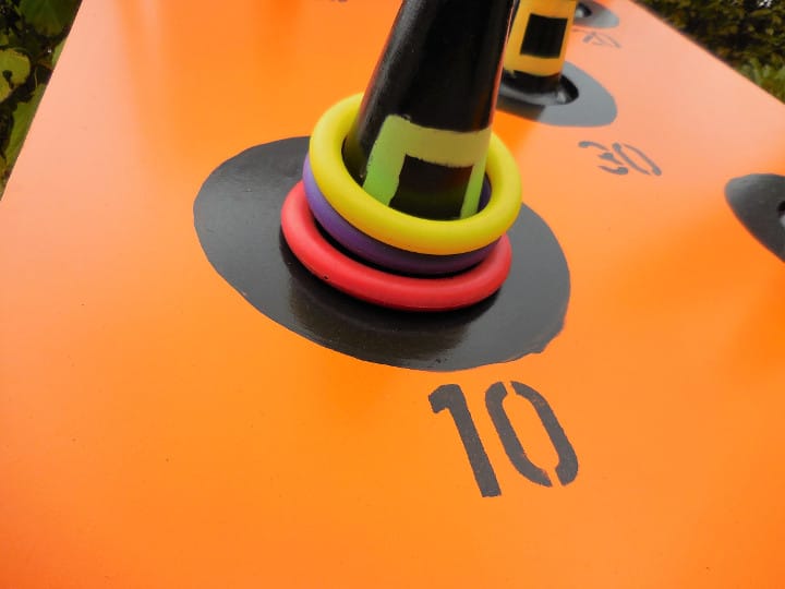 Bei Hexenring werfen geht es darum, die Ringe um die Hexenhüten zu werfen und die meisten Punkte zu bekommen. (die abgebildete Puppe ist nicht im Preis enthalten)